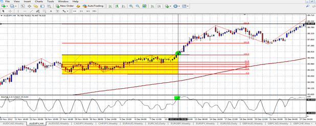 Figure 1: Shows The 4H Chart for the AUD/JPY pair between November and mid-December. One can clearly see that the market made an uptrend (first phase) where after reaching a certain point, tapered off and entered its second phase when it made a sideways consolidation, bouncing between the top resistance and lower support level. Finally, we see that the price broke the upper resistance WITH STOCHASTIC SUPPORT. Still with me?